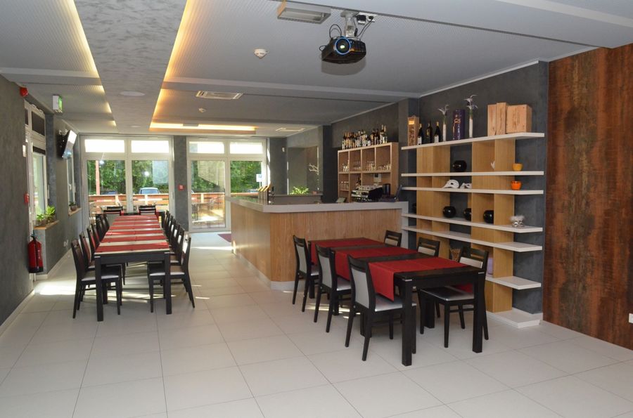 In einem hellen und modernen Rahmen bietet das Restaurant eine Karte mit vielfältigen Rezepten an, wie zum Beispiel gegrilltes Fleisch und Fisch, oder noch eine traditionelle Küche aus der Region Müllerthal - Kleine Luxemburger Schweiz. Das Restaurant kann bis zu 80 Gästen empfangen. Es ist ebenfalls auf die Organisation von Events spezialisiert wo vom schönen Speisesaal profitiert werden kann.