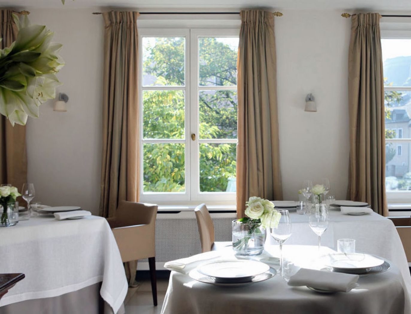 Das "Restaurant Mosconi" lädt seine Gäste ein, im Sommer am Ufer der Alzette am Rande einer grünen und schattigen Terrasse Platz zu nehmen und bietet eine frische Speisekarte mit luftigen Menüs und eine Küche voller mediterraner Aromen, die auf Wert basiert des ersten Produkts, mit Feinheit und Präzision verarbeitet, um eine subtil authentische Raffinesse zu erhalten: „Ich lege nicht viel Wert auf die Dekoration des Tellers, meine Kompositionen bleiben einfach und kombinieren drei oder vier Produkte. " Im "Restaurant Mosconi" werden die Gäste in kleinen Räumen empfangen, die eine raffinierte Atmosphäre bieten, im Schatten prächtiger Kronleuchter, die Tische mit einfachen und authentischen Dekorationen beleuchten, an den Ecken klassischer Holzarbeiten, die die Wände wärmen. Weiße Rosen und Cremefarben umrahmen großzügige Samtquadrate, die einen sanften Rahmen für Gourmet-Entdeckungen bilden.